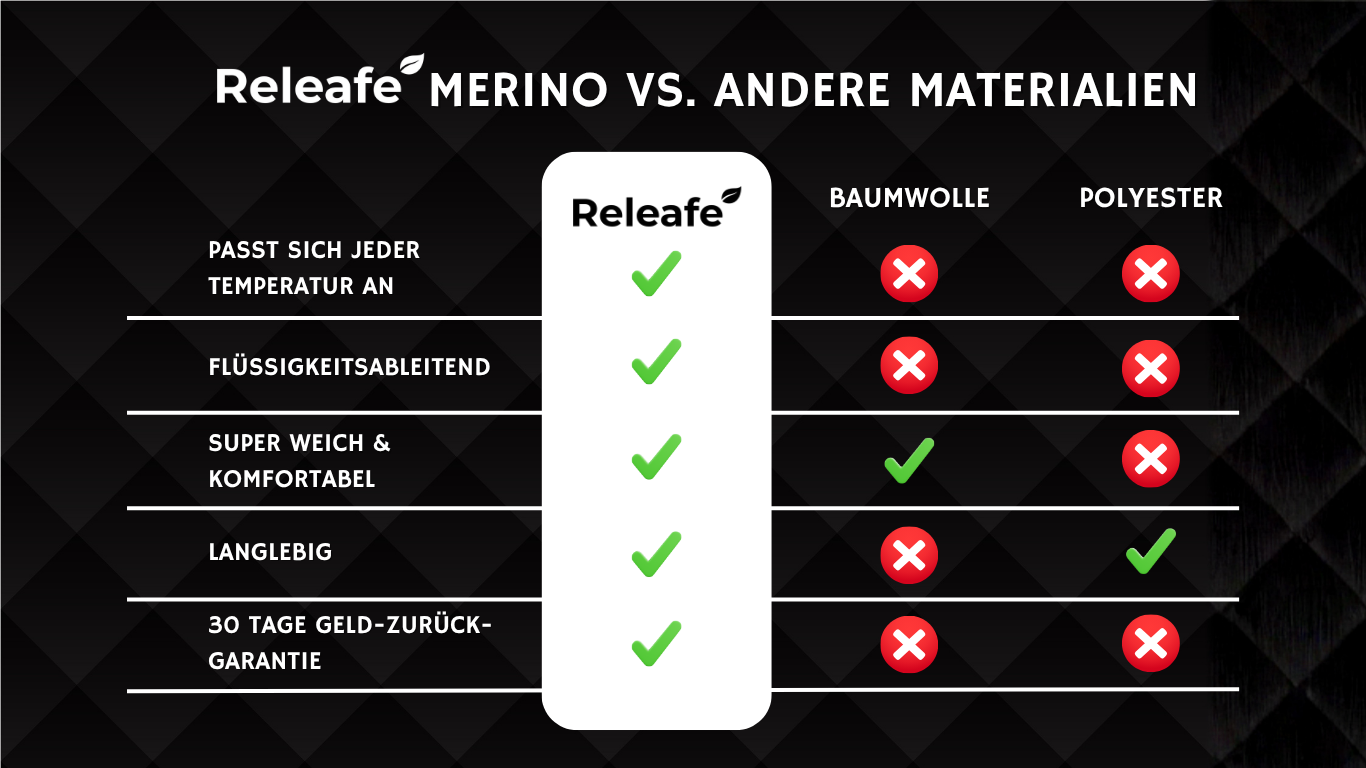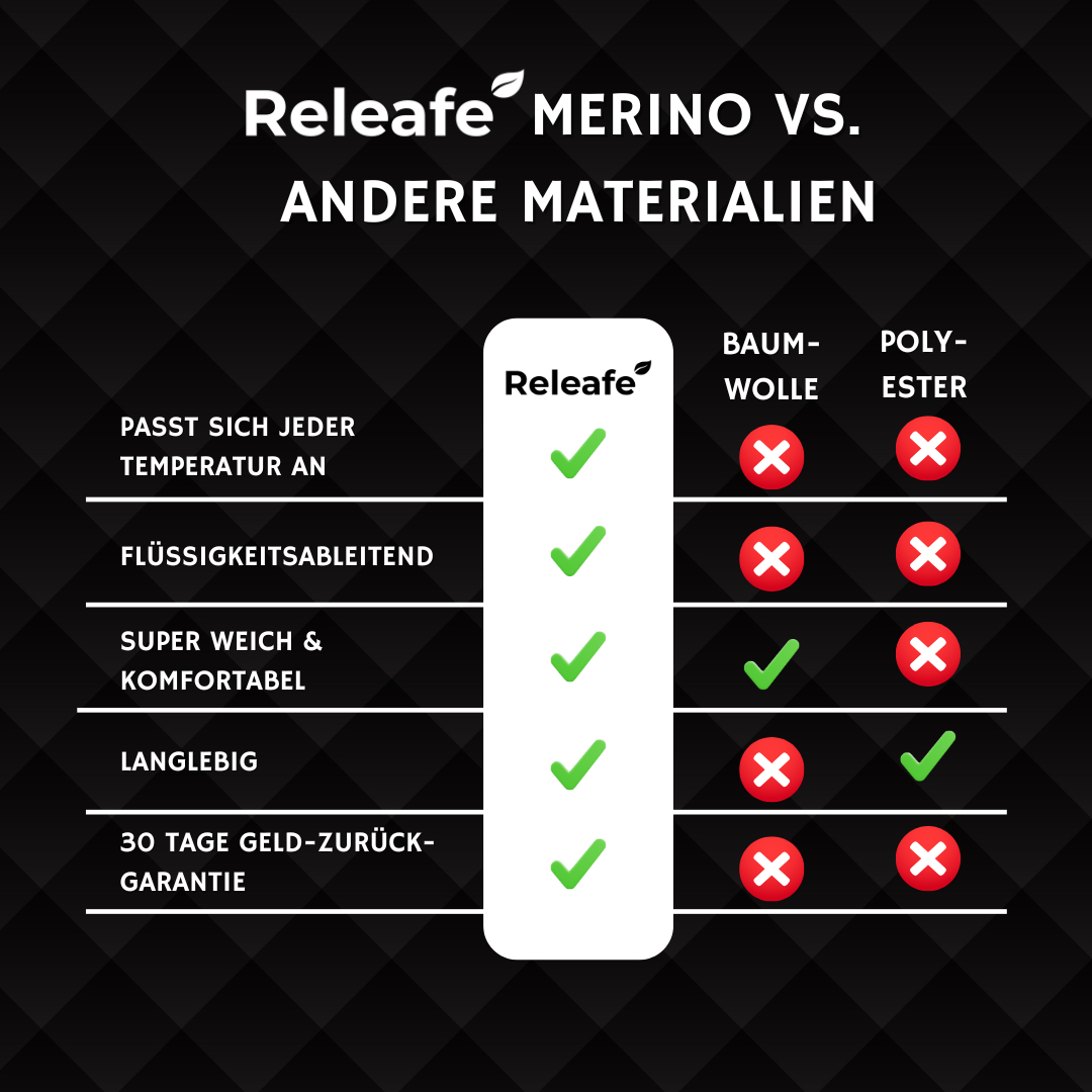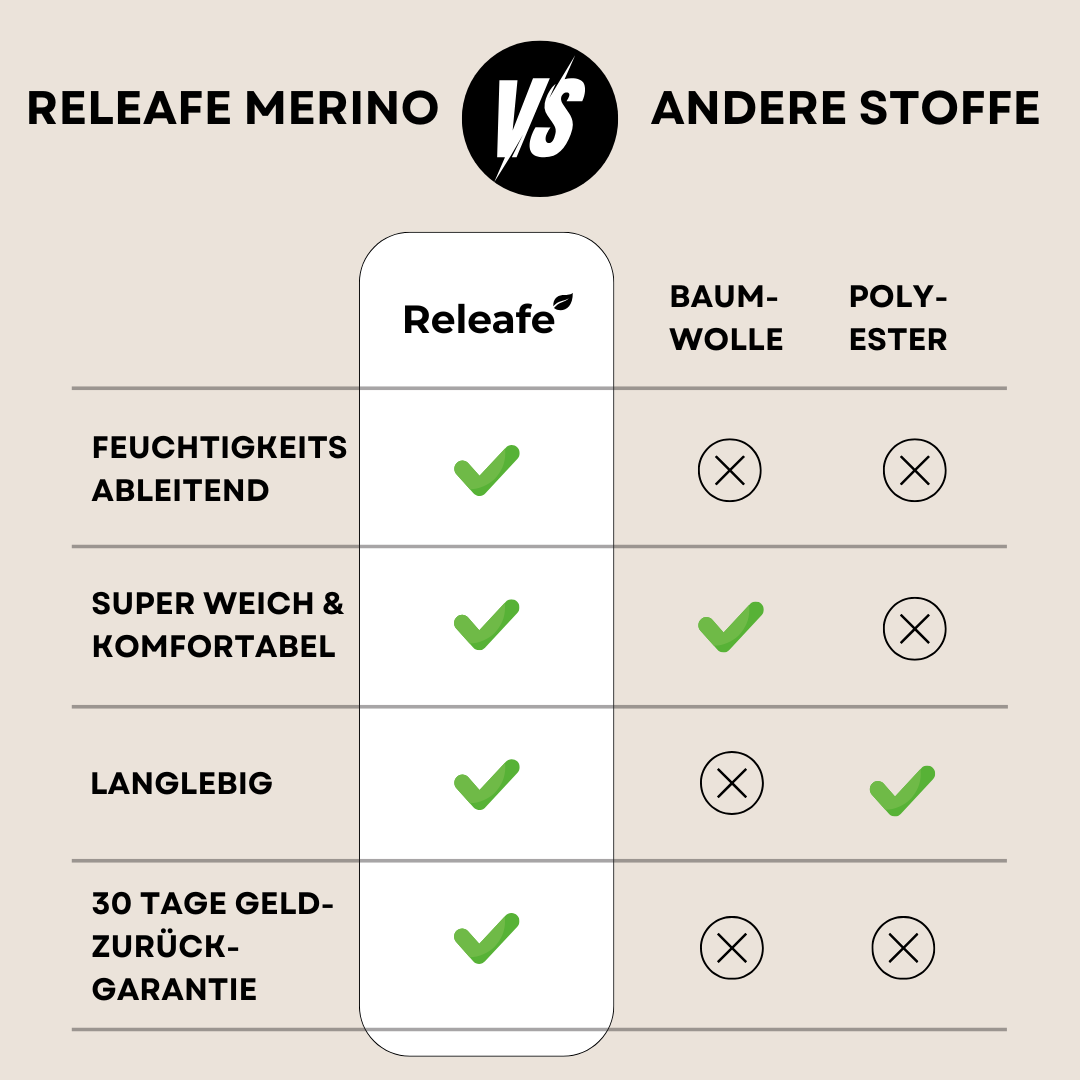 Unsere Merino-Mischung reguliert die Temperatur, leitet Feuchtigkeit ab und verhindert Gerüche — etwas, das Baumwolle nicht kann.